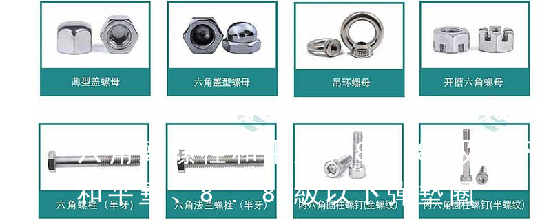 六角薄螺母 Hexagon thin nuts 細牙六角薄螺母 Hexagon thin nuts 木螺釘專用墊圈 Rounds washers for wood constructions 密封帽 Sealing caps,push-in type 活節螺栓B型 Eye bolts form B 內舌止動墊圈 Internal tab GB/T 9074.17-1988 六角頭螺栓和彈簧墊圈及平墊圈組合件;規定了螺紋規格為M3~M12的六角頭螺栓、彈簧墊圈和平墊圈組合件。并沒有對材質做出規定,針對使用部位及性能要求的不同可以查閱GB/T 3098 緊固件機械性能 的系列
